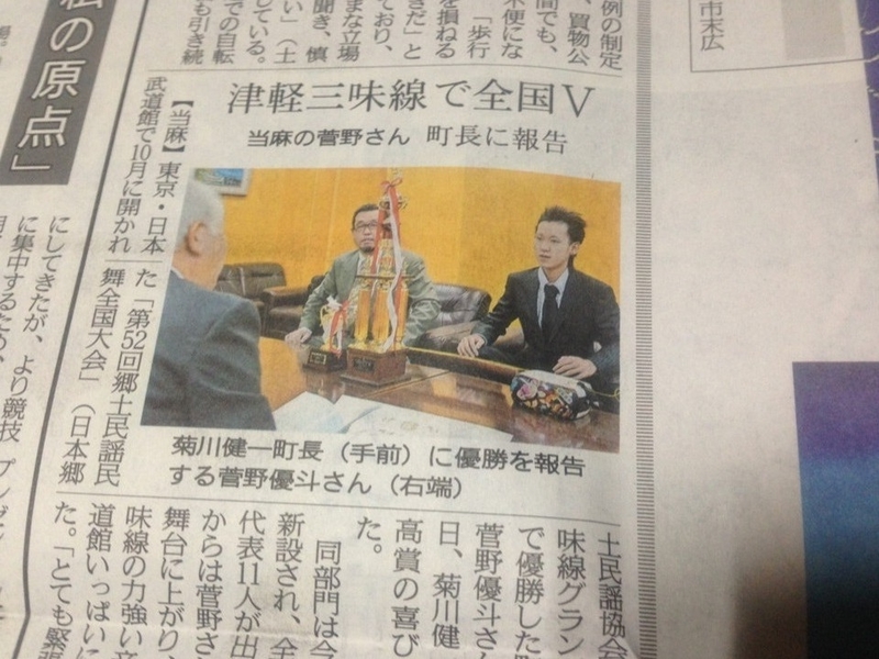 2012-11-14 町長さんにご報告。 津軽三味線 10月の郷土民謡・民舞全国大会で優斗が三味線の部でグランプリとったのを昨日、当麻町長さんにご報告にいってきました。 町の広報さんと北海道新聞の記者さんも居て、緊張しました! てか、優斗が主役で私は何でもないのですが(^^:)アハハ しか~し! 昨日の夕方4時から役場の町長室での報告だったのですが、今朝の新聞に載っててビックリ!!!早くてビックリ! 昨日の「30年を祝う会」も見に来てくれた町長さん。色々なお話しをさせていただきました。
