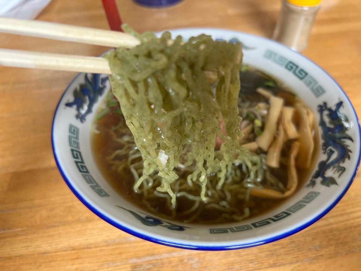 麺にも昆布が入ってるみたいで、グリーン麵みたいにミドリ色の麵でした。